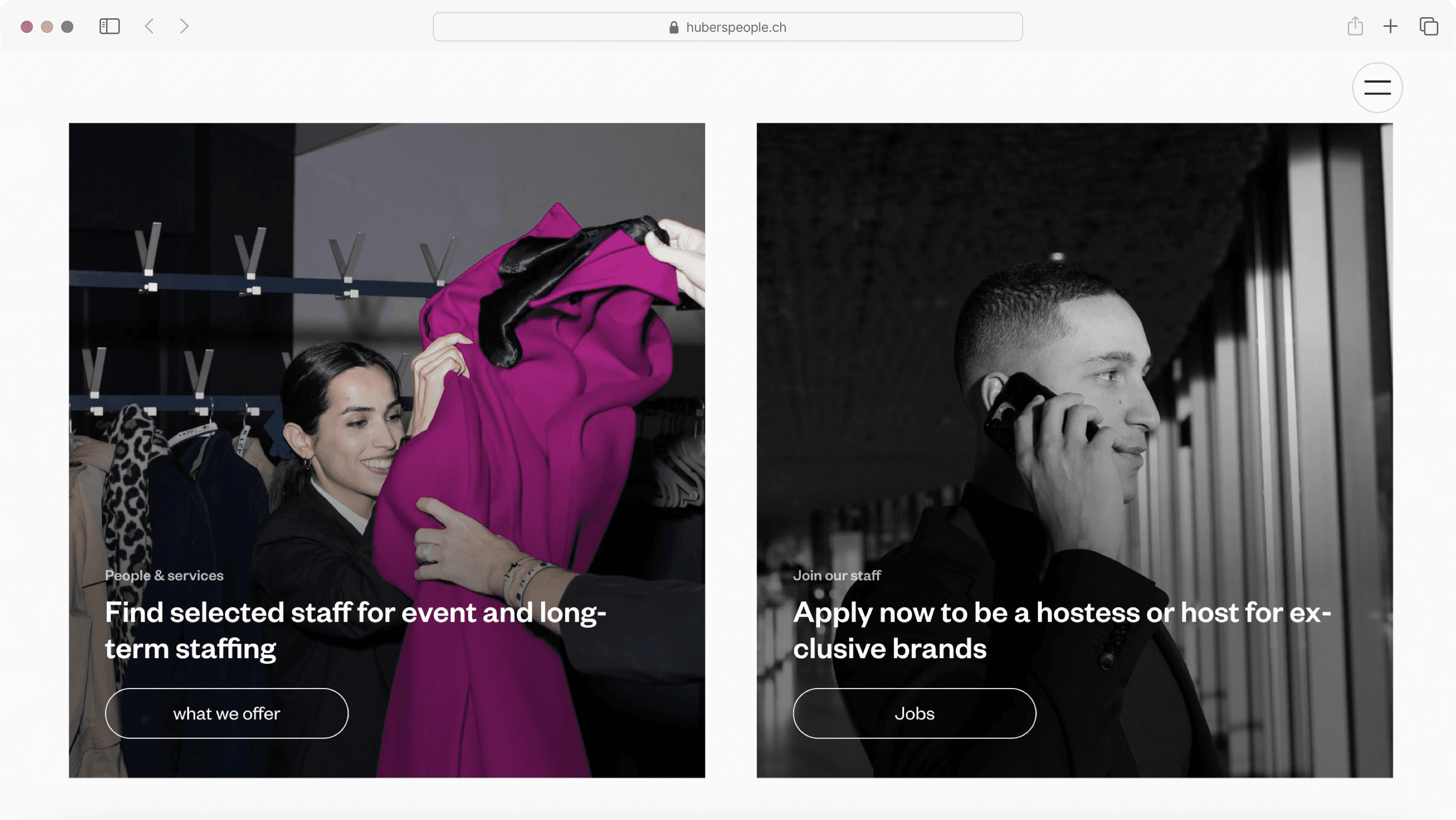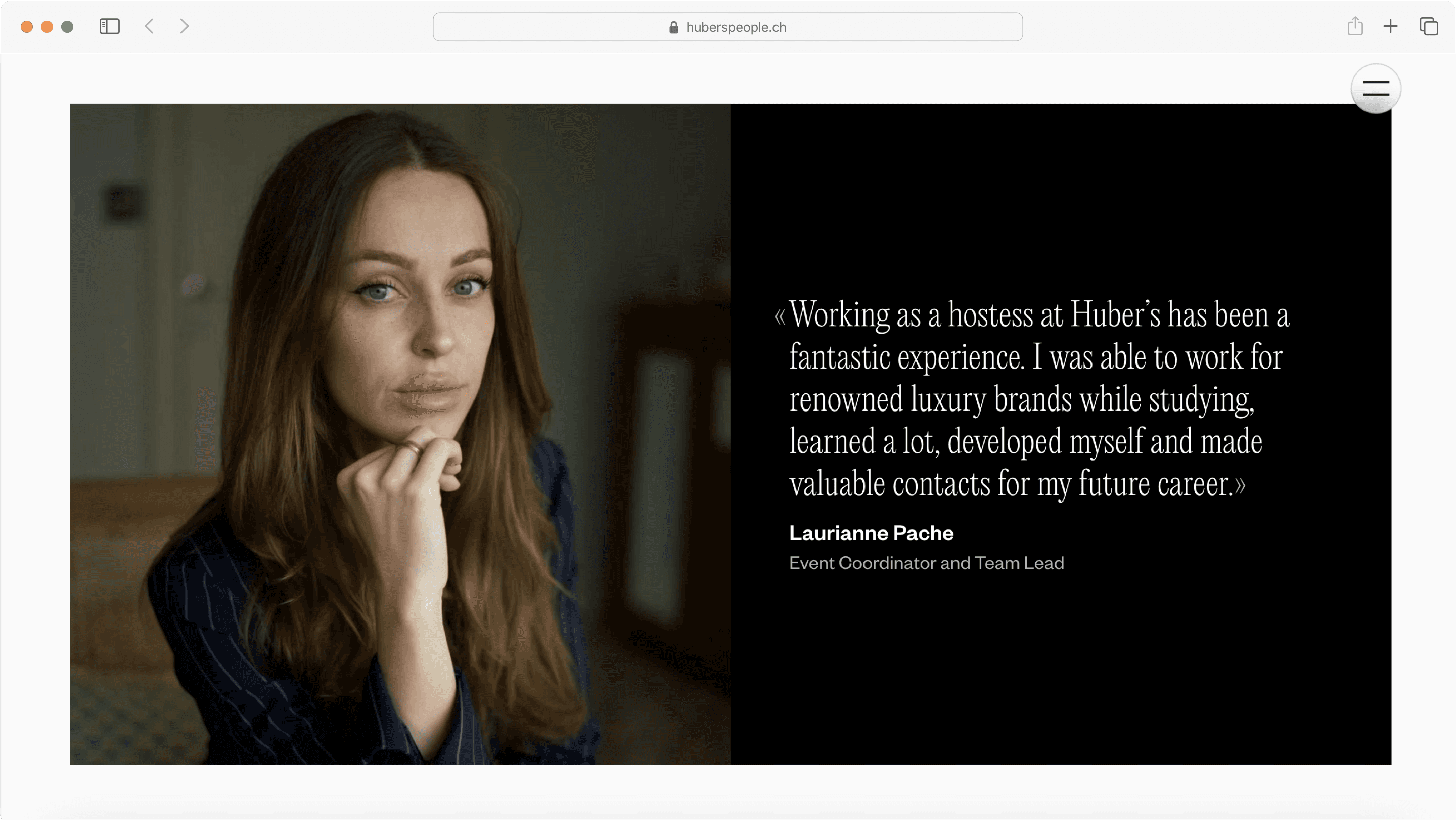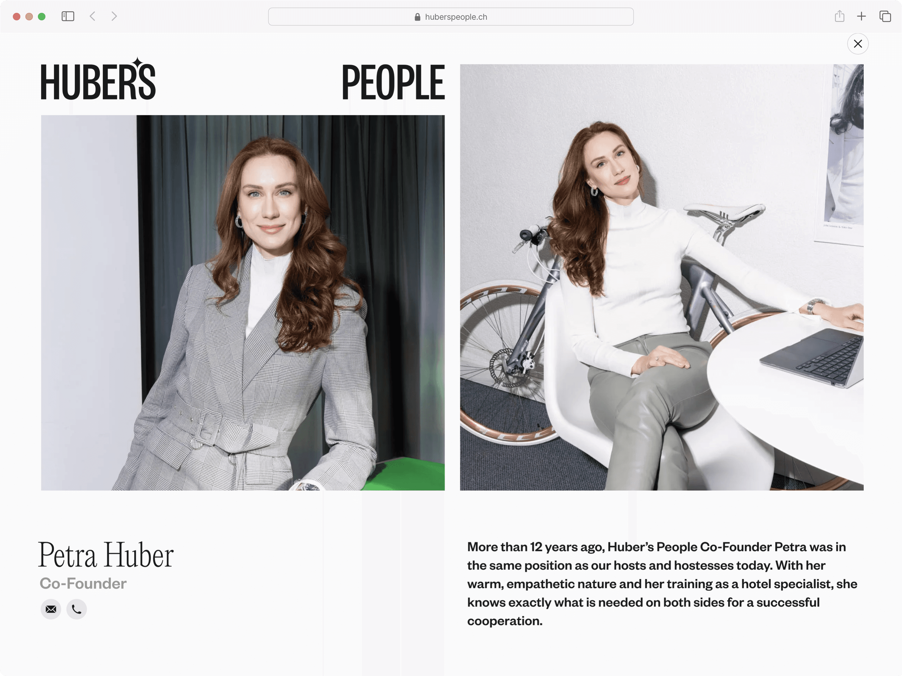 Huber’s People is a renowned Swiss agency that connects exclusive brands with the right hosts for events and projects. As part of the website relaunch, the aim was to sharpen the company’s positioning in the premium segment and support future recruiting efforts through a clear and consistent digital presence. The website was created as part of my work during my employment at allink.